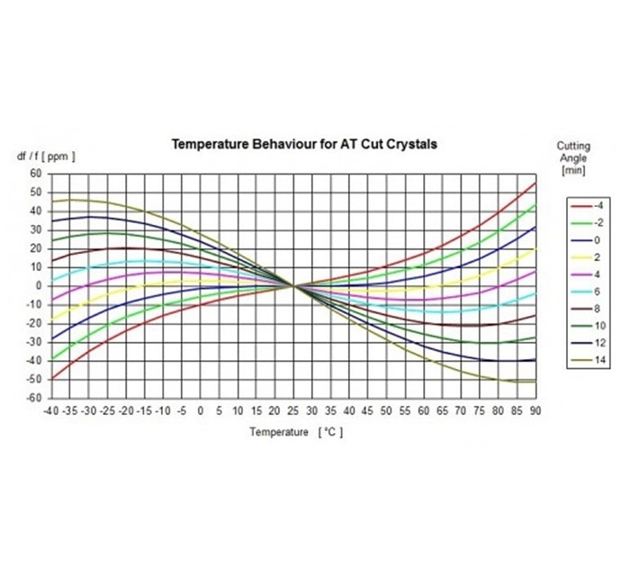 The graph below shows that to achieve high stability together over a temperature range limits the number of angles at which we can cut the crystal. If you only need a narrow operating temperature range or can tolerate relatively large changes in frequency over temperature, perhaps ±40 ppm, it makes crystal cutting easy. But extending the temperature range or tightening the stability requirement limits the choice of cutting angles.
