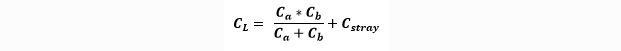 For the total load capacitance in the circuit, all capacitances need to be considered. Therefore, not only the two capacitors, but also the input and output capacitance of the microcontroller and all stray capacitances must be taken into account. This all together forms the load capacitance. The biggest problem now is that it is impossible to know or determine the stray capacitance without an actual circuit. Therefore, during the PCB Design you have to just guess the stray capacitance and later recheck with the final circuit if the frequency is within the tolerance. Working in the industry for several decades, we experienced that the typical stray capacitance in Pierce oscillation circuit is between 3 pF to 7 pF. With this in mind you can easily determine the values for the two external capacitors Ca and Cb with this formula: